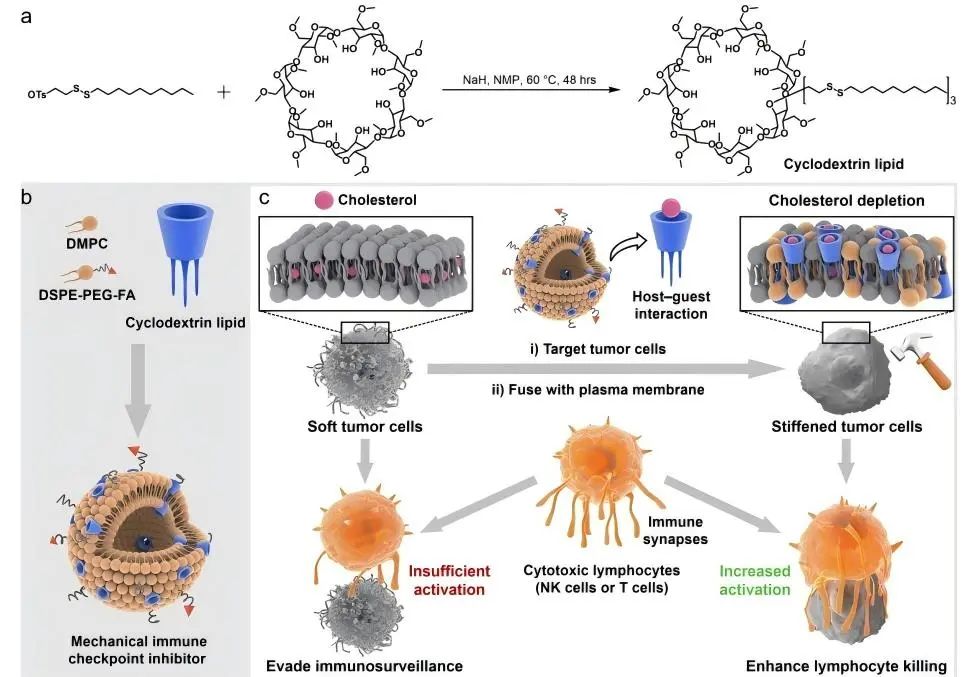 图3 增加癌细胞硬度抵抗免疫逃逸。A)环糊精(CD)的合成。B)MICI 的纳米结构。C)MICIs与肿瘤细胞的质膜融合的示意图。通过消耗胆固醇增强肿瘤细胞硬度及增强NK细胞、细胞毒性T细胞的杀伤作用