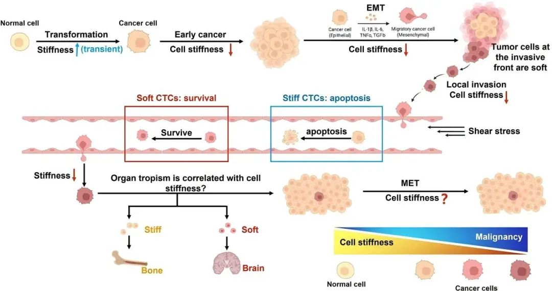 研究表明,肿瘤组织的机械性能在细胞和组织水平上都具有高度的异质性。具体表现为以下两个主要方面:①肿瘤细胞相较于其他细胞更“软”,这使得它们可以更好地逃避淋巴细胞的识别和攻击;②肿瘤组织相较于其他组织更“硬”,通过抑制免疫细胞的机械信号传导通路,导致免疫细胞功能耗竭。